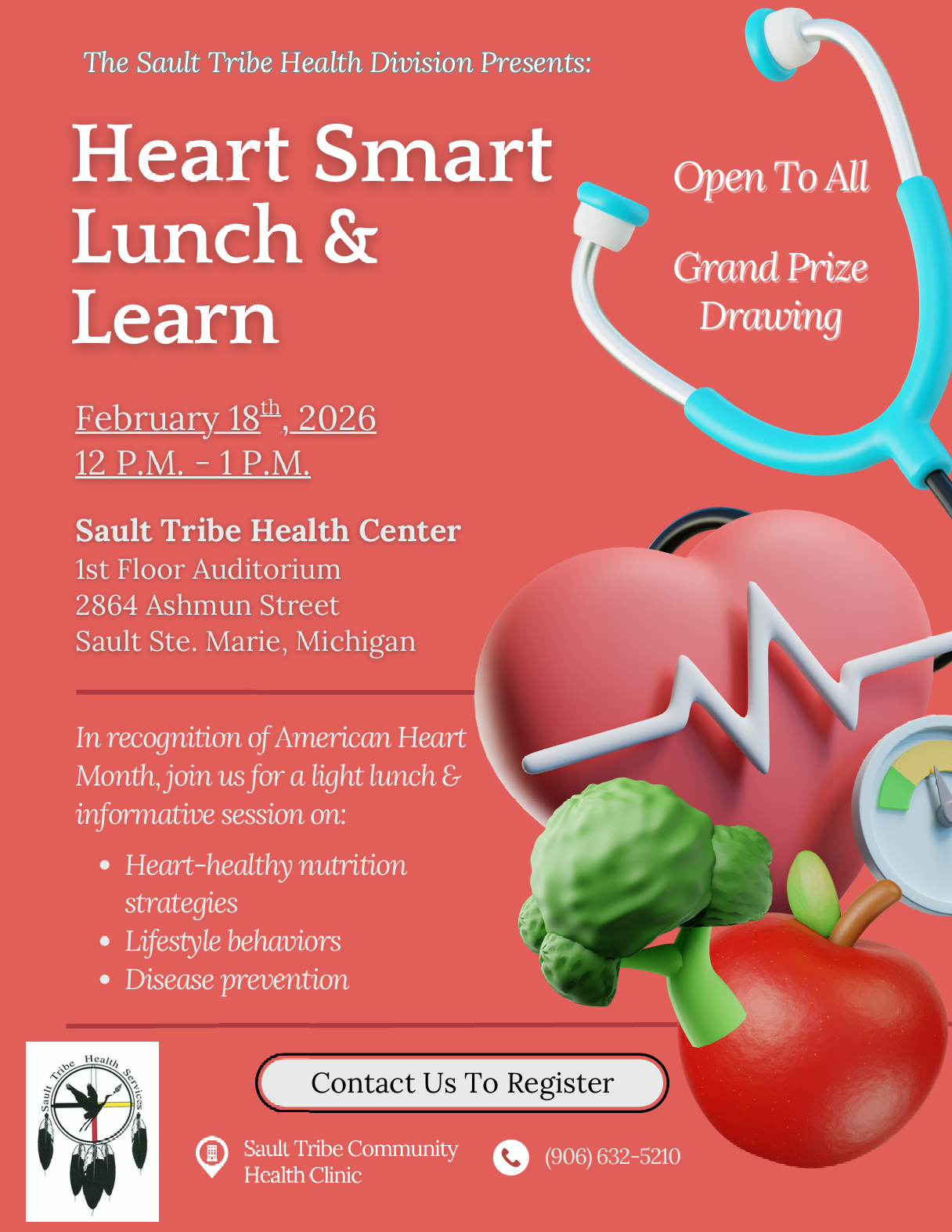 Sault Ste. Marie Tribal Health Center – Walk-In 2864 Ashmun St. Sault Ste. Marie, MI 49783 P: 906-632-5200 Hours: M-F, 8am-7:30pm Closed: Weekends and Tribal holidays